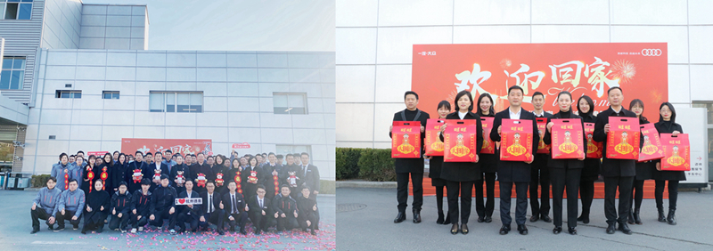在杭州德奧,汽車事業(yè)部董事長莫見忠、汽車事業(yè)部執(zhí)行總經(jīng)理兼杭州德奧總經(jīng)理沈美琴攜各部門總監(jiān)給全體員工分發(fā)新年旺旺禮包,寓意在新的一年開啟美好的征程。