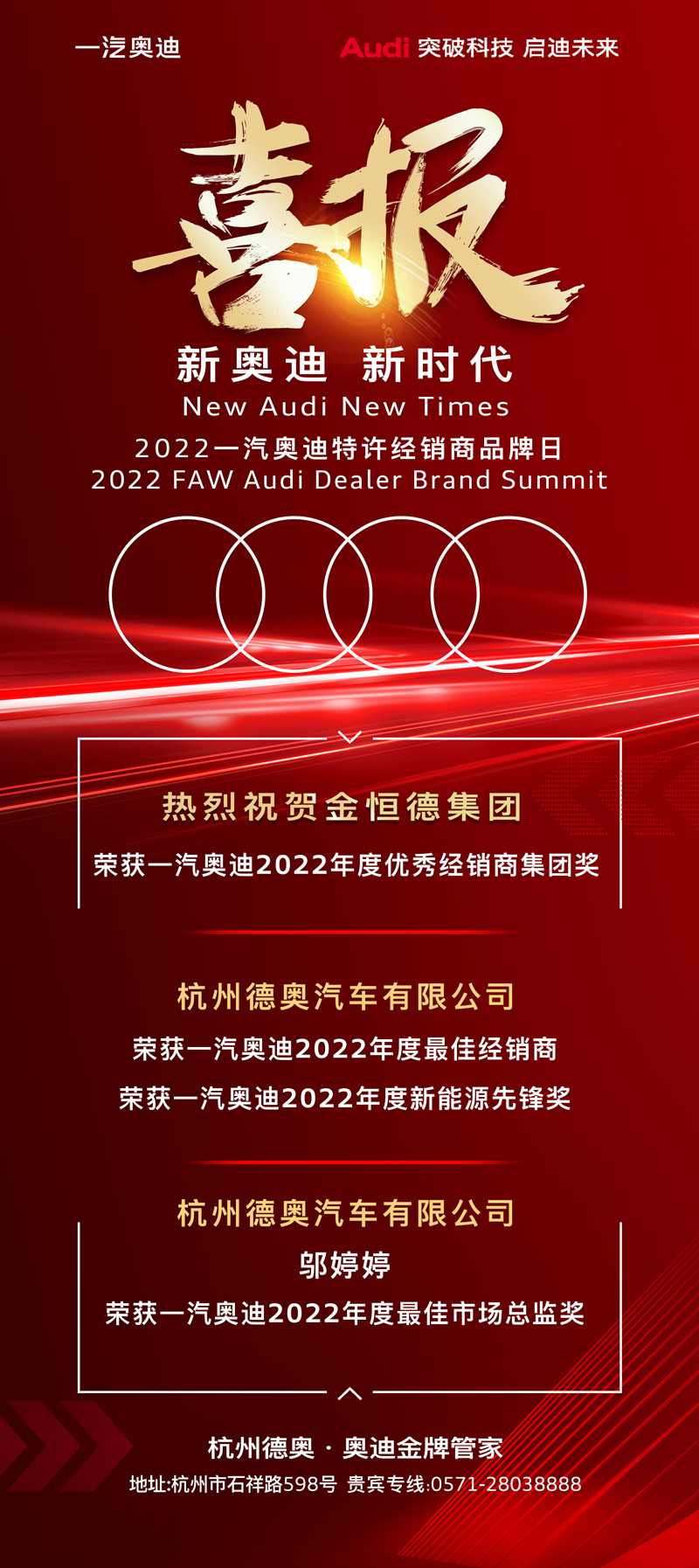 此次品牌日,舉行了經(jīng)銷商年度工作溝通會及頒獎典禮。金恒德集團(tuán)汽車板塊各奧迪店憑借年度優(yōu)異的經(jīng)營業(yè)績及出色的經(jīng)營管理表現(xiàn),得到奧迪品牌經(jīng)銷商網(wǎng)絡(luò)高度的評價與認(rèn)可。金恒德集團(tuán)榮獲“一汽奧迪2022年度優(yōu)秀經(jīng)銷商集團(tuán)獎”;杭州德奧榮獲“一汽奧迪2022年度最佳經(jīng)銷商”、“一汽奧迪2022年度新能源先鋒獎”;杭州德奧市場總監(jiān)鄔婷婷榮獲“一汽奧迪2022年度最佳市場總監(jiān)獎”。